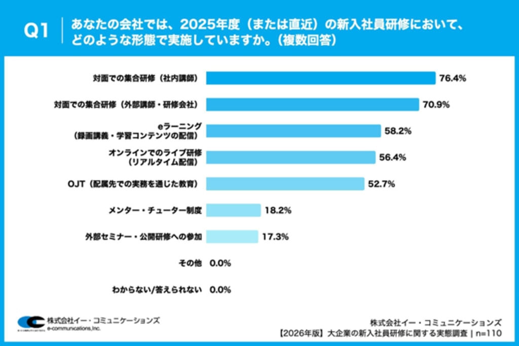 「Q1. あなたの会社では、2025年度(または直近)の新入社員研修において、どのような形態で実施していますか。(複数回答)」(n=110)と質問したところ、