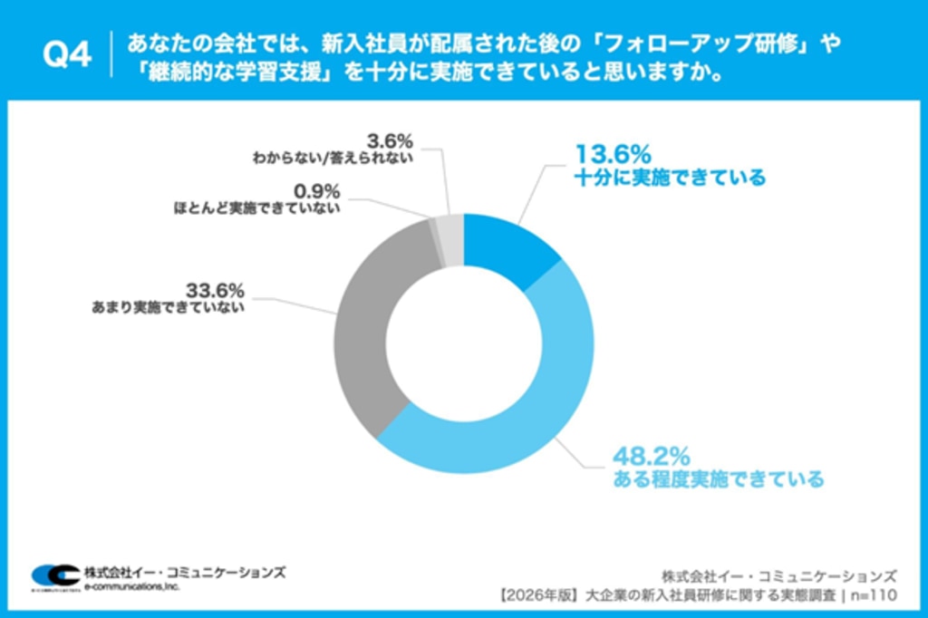 「Q4. あなたの会社では、新入社員が配属された後の「フォローアップ研修」や「継続的な学習支援」を十分に実施できていると思いますか。」(n=110)と質問したところ、