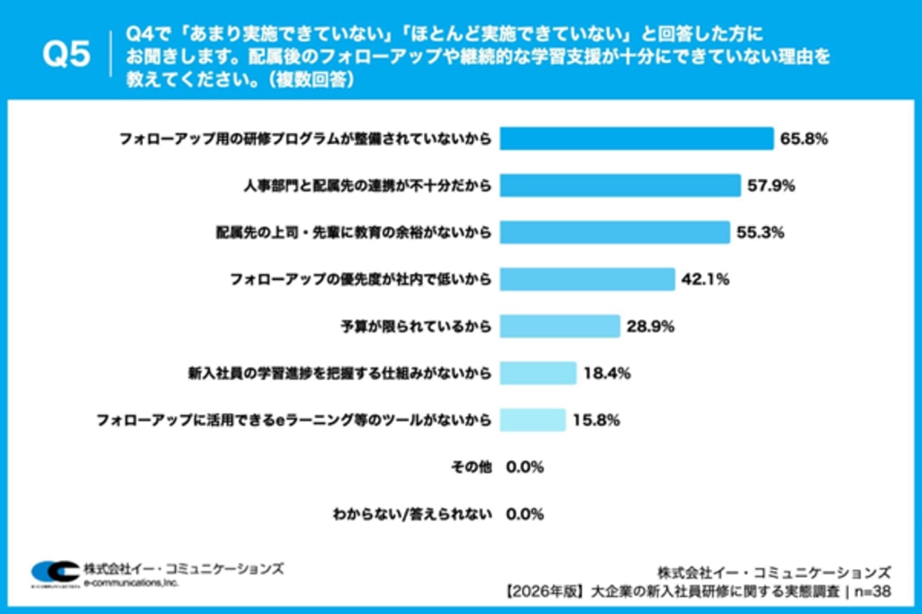 「Q5. Q4で「あまり実施できていない」「ほとんど実施できていない」と回答した方にお聞きします。配属後のフォローアップや継続的な学習支援が十分にできていない理由を教えてください。(複数回答)」(n=38)と質問したところ、