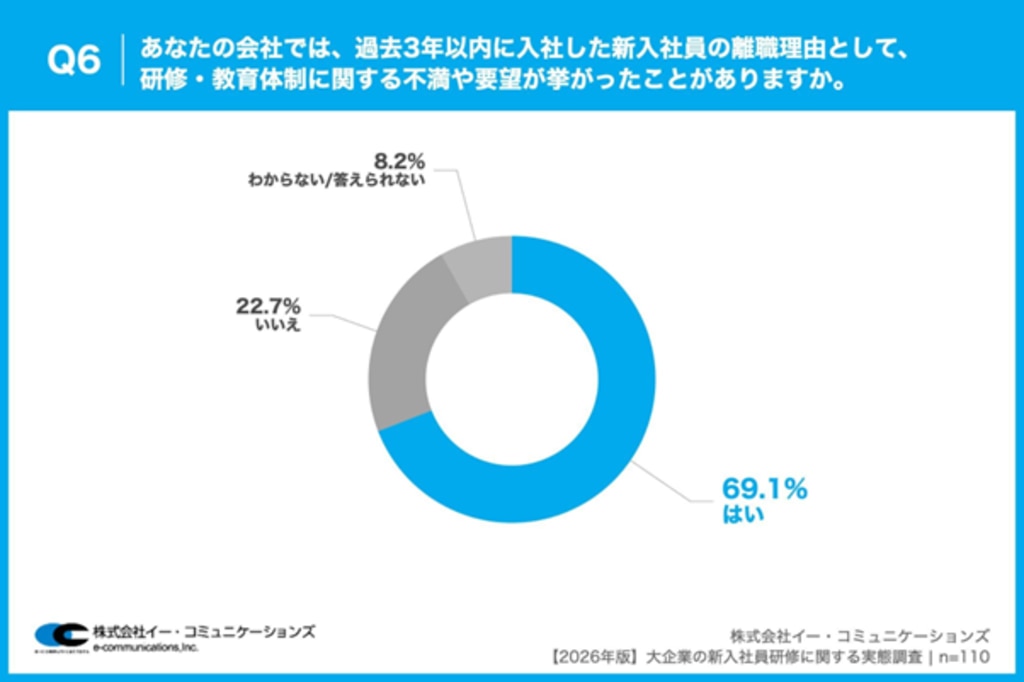 「Q6. あなたの会社では、過去3年以内に入社した新入社員の離職理由として、研修・教育体制に関する不満や要望が挙がったことがありますか。」(n=110)と質問したところ、