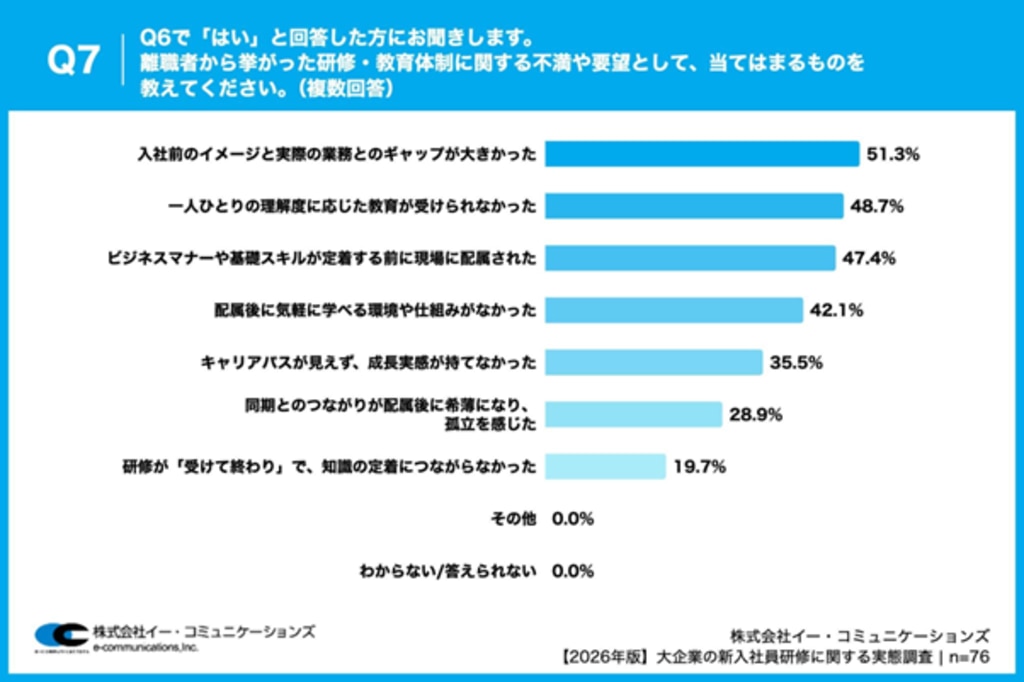 「Q7. Q6で「はい」と回答した方にお聞きします。離職者から挙がった研修・教育体制に関する不満や要望として、当てはまるものを教えてください。(複数回答)」(n=76)と質問したところ、